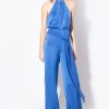 Sleeveless jumpsuit in ultra-light flowing fabric. Halterneck with draping at the front, open back and lacing at the back of the neck. Matching-fabric sash belt to tie at the waist and wide-leg trousers. Concealed central zip fastening on the back. – Model is 177cm tall and wears a size 40.