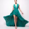 Extra-long, sleeveless dress in light viscose georgette. Plunging V-neck fastened with long ribbon ties at the back which drape freely when knotted. Empire waistline and asymmetrical skirt with short front and extra-long back and sides with train and frilly edging. Concealed central zip fastening on the back. This garment is part of the “Dress to Impress” partywear capsule collection.