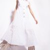 Sleeveless satin midi dress. Halterneck with scalloped edge at the side, high neck fastened at the back and open back. Flowing midi skirt with wide floral lace trim at the asymmetric hem. This piece is made from sustainable material containing recycled fibres, with the aim of reducing resources used and increasing product quality. This piece is made from material that is processed without substances that may harm the environment or consumer health.