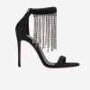 Soft suede sandals with ankle strap embellished with rhinestone fringing. Round toe and leather sole with 10-cm stiletto heel. Padded leather insole and breathable microfibre lining. Zip fastening at the heel.