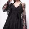 Short lace dress with floral pattern. V-neck, long bell sleeves and empire waistline with frill beneath the bust. Skirt with delicate pleating, flounce at the bottom and scalloped hem. Comes with a slip that offsets the see-through effect of the lace.