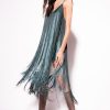 Short, sleeveless and straight-cut crepe de Chine dress with long tone-on-tone fringing all over. Halterneck with open back, thin straps and button fastening at the back. – Model is 177cm tall and wears a size 40.