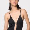 Asymmetric one-piece swimsuit in technical stretch jersey, with tropical floral print. Thin, criss-crossing shoulder straps, cut-out at the side and printed PINKO logo on the back. – Model is 178cm tall and wears a size 40.