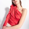 One-shoulder top in stretch satin fabric, with draped design and slightly puffed long sleeves with cuff. Complete with long sash that can be knotted or left as it is on one side. – Model is 175cm tall and wears a size 40.