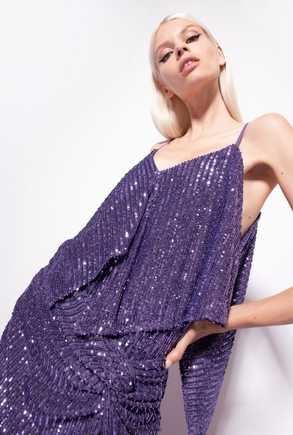 Sleeveless top with sequin embroidery all over and vertical striped pattern. Constructed with panels that create a three-dimensional draped effect, thin shoulder straps and V-neck on the front and back. – Model is 175cm tall and wears a size 40.