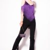 Crepe de Chine top with layered, tone-on-tone fringing all over. V-neck at the front and back, thin straps with small metal rings, and open shoulders with partial sleeves embellished with fringing. Pointed hem. – Model is 175cm tall and wears a size 40.
