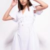 Short dress in cotton poplin. V-neck with drawstring to tie into a bow, gathering and short cap sleeves. Cinched waistline marked by a waist-effect insert and short, slightly flared skirt. – Model is 178cm tall and wears a size 40.